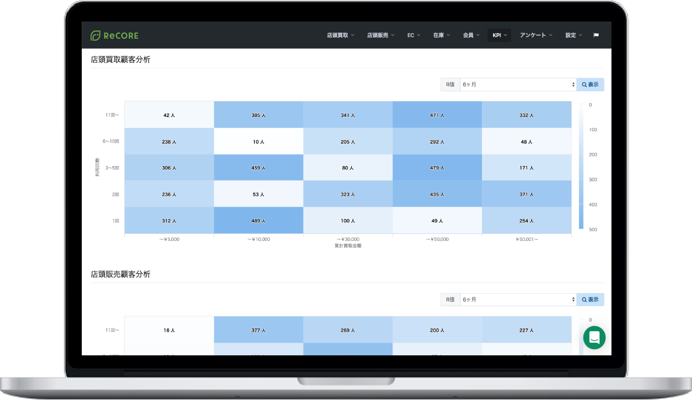RECOREの顧客管理機能では、RECORE画面上でRFM分析を行うことが可能です。