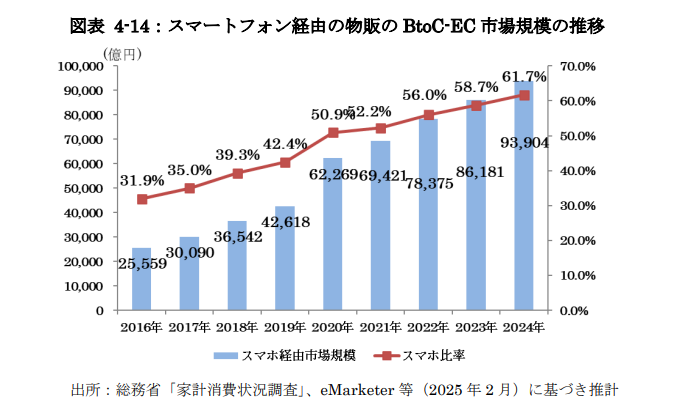 物販分野のEC市場では、スマホ経由の取引が全体の61.7%を占めています(2024年時点)。