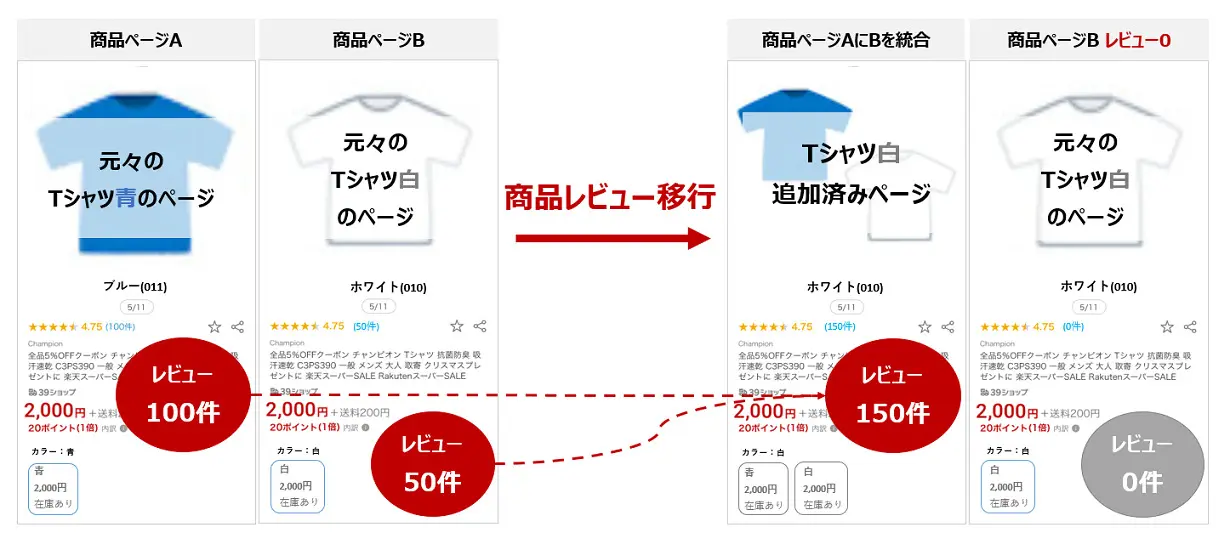 従来の楽天市場の仕様だと、もともと別ページで管理されていた商品は、ページごとに商品レビューが蓄積される仕組みになっていました。