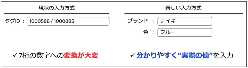 楽天SKUプロジェクトが始まると、この7桁の数字「タグID」がなくなり、「商品属性」をよりわかりやすい実際の値で登録することができます。