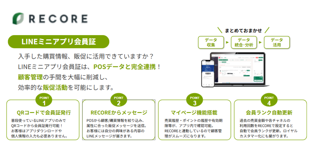 LINEミニアプリと連携しているので、LINEミニアプリを活用したアプリ管理や、LINEでの販促メッセージが可能となっております。