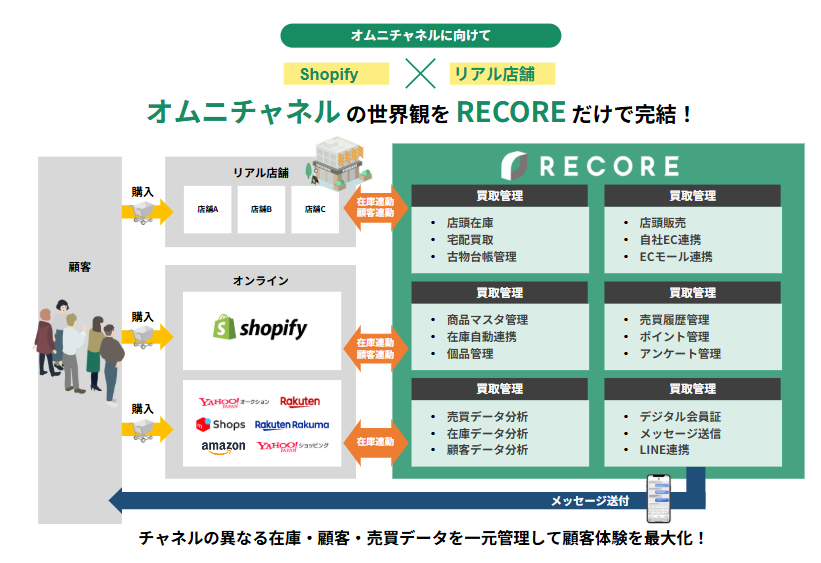 対してRECOREでは、複数モールの同時出品やクレジット端末の連携、LINEミニアプリの連携、買取機能が可能になるため、実店舗に力を入れている企業や複数モールへの出品を行いたい企業にはおすすめとなっております。