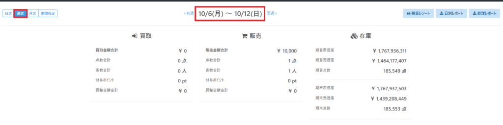 例えば、集計週の切替開始曜日を「月曜日」で指定し、経理レポートで「週次」を指定した場合、日付には「月曜日」~「日曜日」までの期間で集計されます。