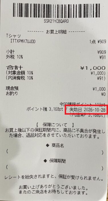 本機能リリースにより、出力レシートの会員が保有しているポイントに対して『失効日』が表示される機能を追加いたしました。