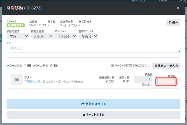 今回のリリースにより、店間移動の受け取り操作画面の『検品数』がデフォルトで空白となる仕様へと変更いたしました。