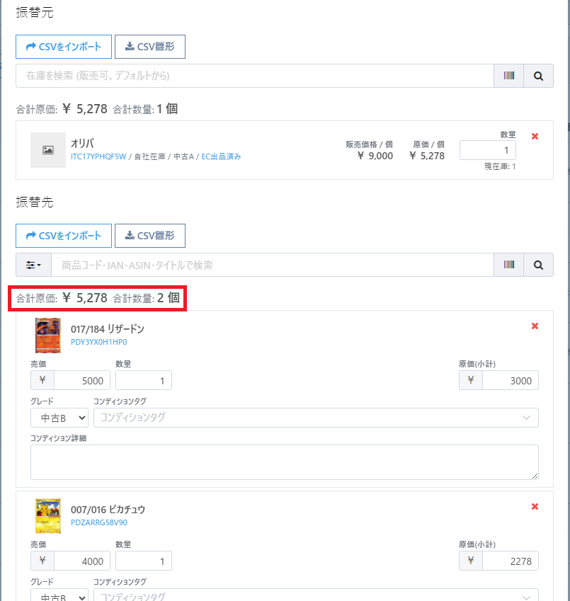 在庫振替時の振替先に原価と数量の合計を表示する機能の追加