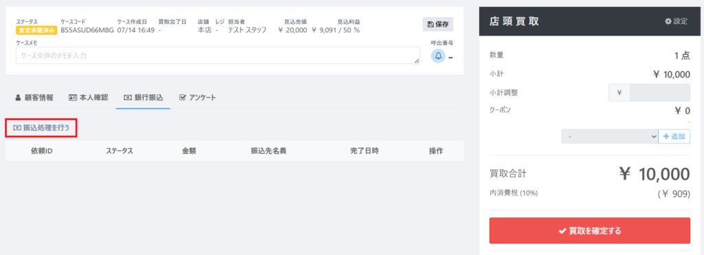 『査定承諾済み』のステータスに遷移後に【振込処理を行う】ボタンが表示されます。