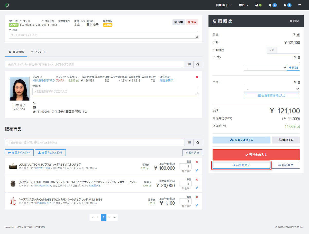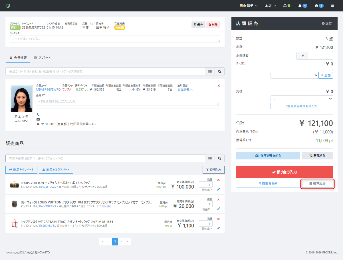 【店頭販売>新規販売】より通常通り販売商品の入力、会員呼び出しなどを行います。