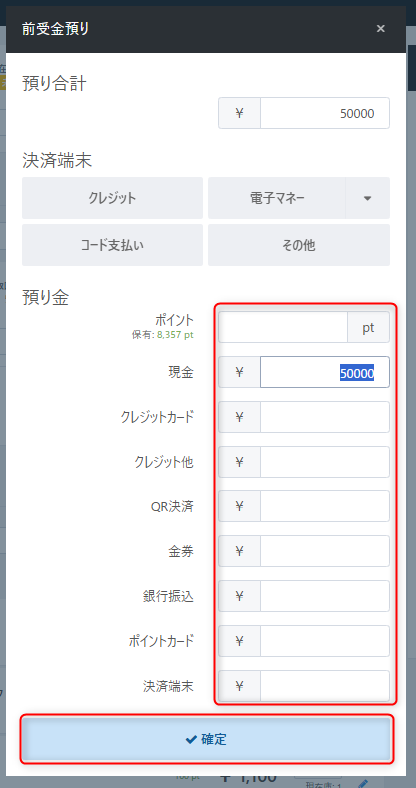 店頭販売での販売処理において、販売金額の一部を前受け金として処理できる機能を追加しました。