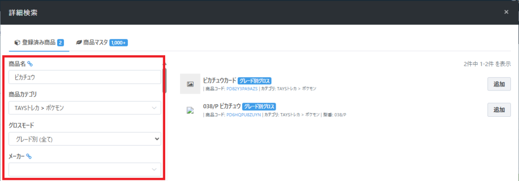 ・詳細検索から買取商品の新規作成をする場合、検索条件を引き継いだカタログ作成