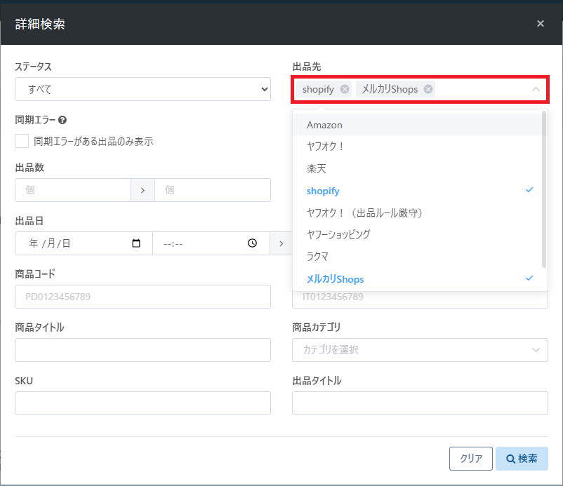 今回のリリースにより、ECの【出品リスト】【受注管理】画面の詳細検索より【出品先】モールの検索を複数選択して1度に検索できるようになりました。