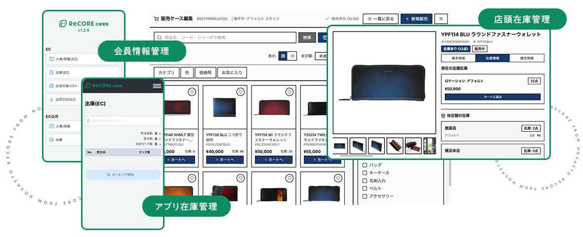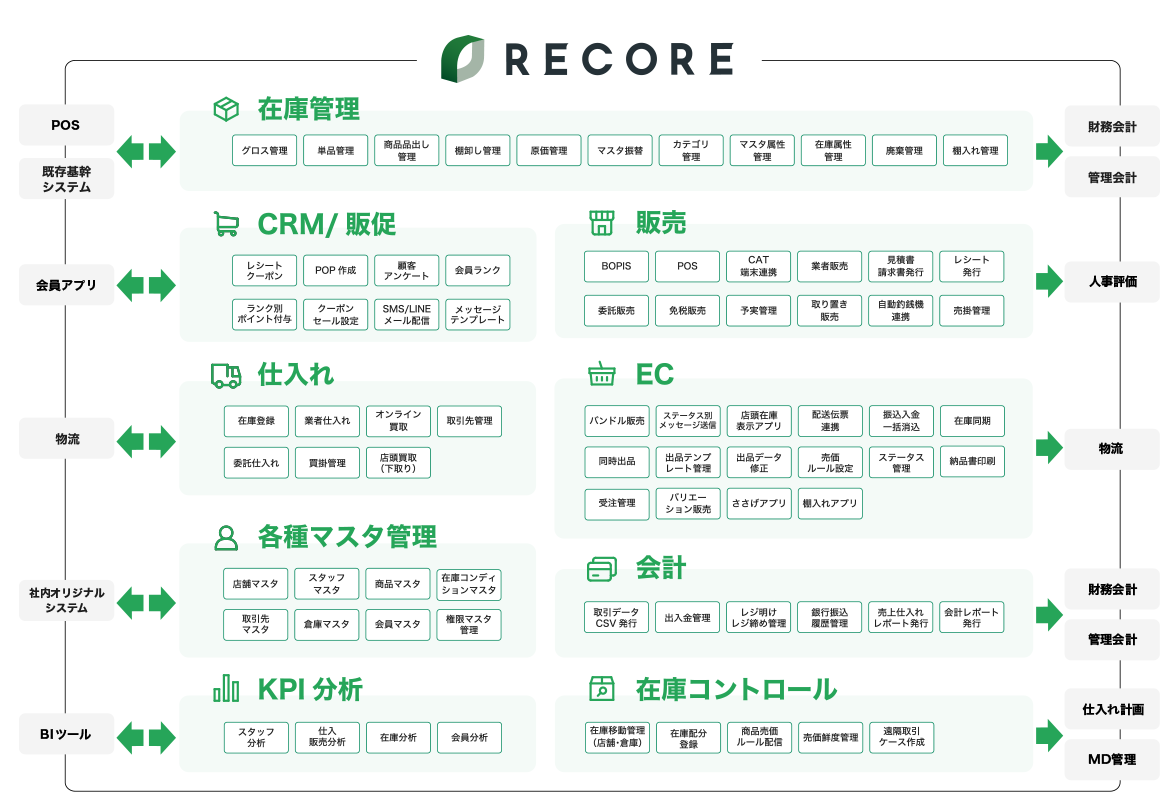 RECOREは、オムニチャネルを前提に設計されたクラウド基幹システム。店舗・EC・会員・在庫のすべてをつなぎ、ひとつの画面からコントロールできます。